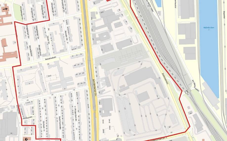 - Königsberger Straße ab 2a (ausgenommen 1a-1d, 3a-3d und 5a-5d) bis Amsterdamer 281
