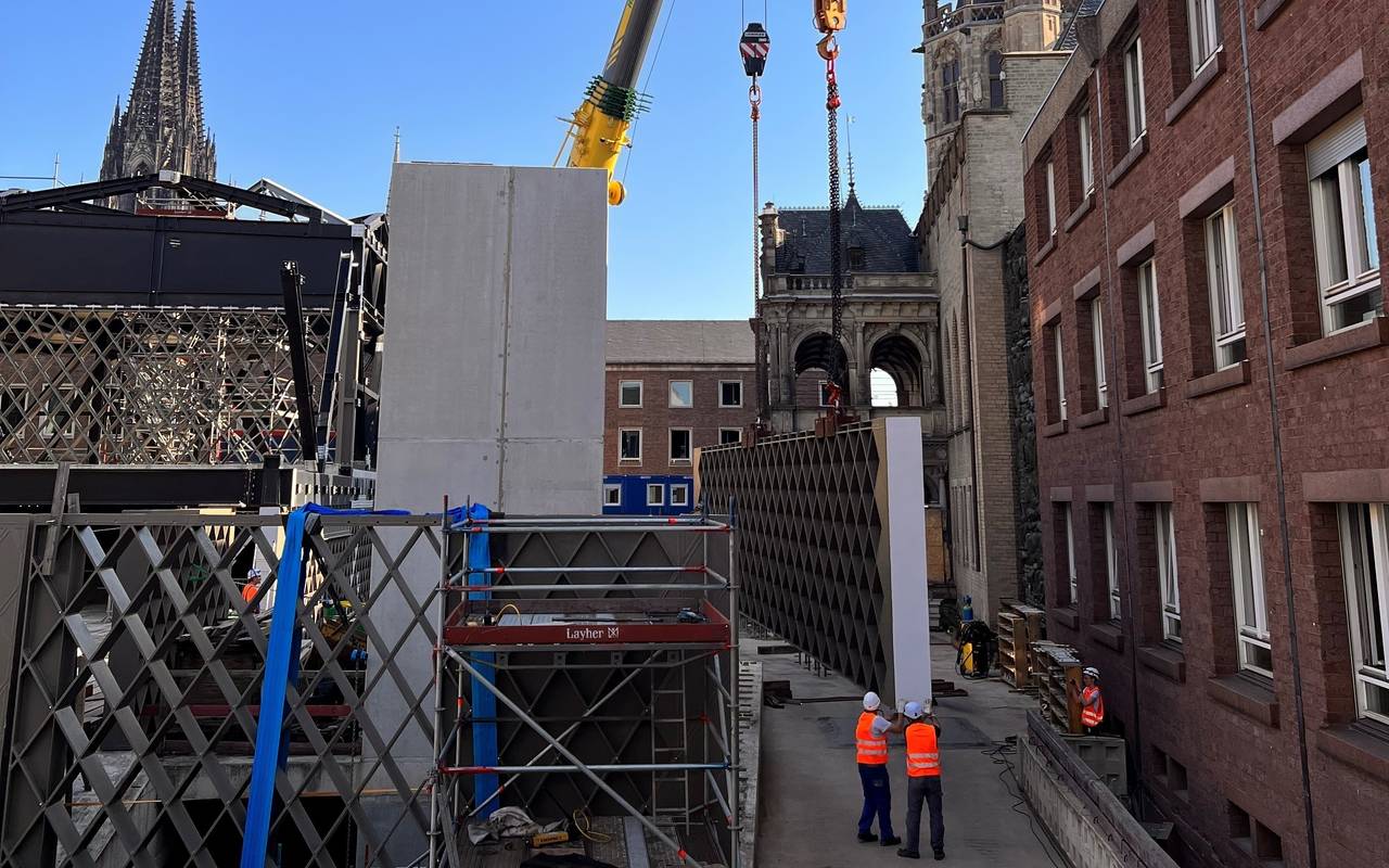 Die größere Raute aus Stahl ist 15 Meter lang und über 23.000 Kilo schwer. Sie an ihren Platz zu wuchten dauert, laut der Stadt Köln rund zwei Stunden. Das „MiQua“ ist Teil vom Archäologischen Quartier Köln, das aktuell auf dem Kölner Rathausvorplatz entsteht. Das Museum im Herzen der Kölner Altstadt wird aus einer unterirdischen Fundebene und einem Neubau bestehen. Dort werden mit dem römischen Praetorium, dem mittelalterlichen jüdischen Viertel und dem Goldschmiedeviertel einige der bedeutendsten archäologischen Funde aus der Kölner Stadtgeschichte präsentiert.