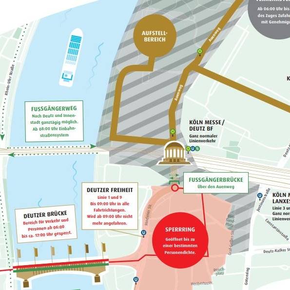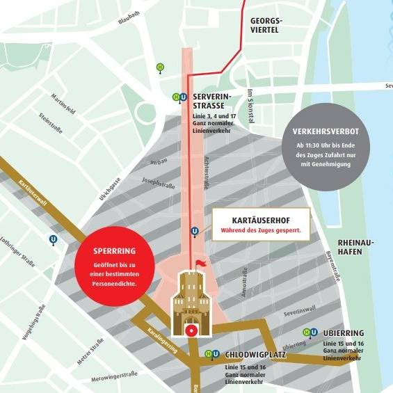 Schon früh am Morgen wird es sowohl im Startbereich in Deutz, auf der Deutzer Brücke und rund um die Severinstorburg in der Südstadt Absperrmaßnahmen geben. Planungen, die es schon seit einigen Jahren gibt, laut Zugleiter Holger Kirsch seit 2019. Seitdem gab es den Traum, den Zug über den Rhein ziehen zu lassen und jetzt ist es soweit. Dafür müsste viel geplant und organisiert werden: Zugweg, Absperrmaßnahmen, Personenbegrenzungen in bestimmten Bereichen und zum Beispiel auch auf der Deutzer Brücke. Sicherheitstechnisch wolle man aber trotz der großen Euphorie und nach der zweijährigen Pause alles im Blick haben. So erwartet Kirsch, dass in diesem Jahr noch einmal mehr Zuschauer nach Köln kommen, sich den Zug anzuschauen. Das liege einmal am Jubiläum, aber auch an der veränderten Route. Darauf werde man vorbereitet sein.