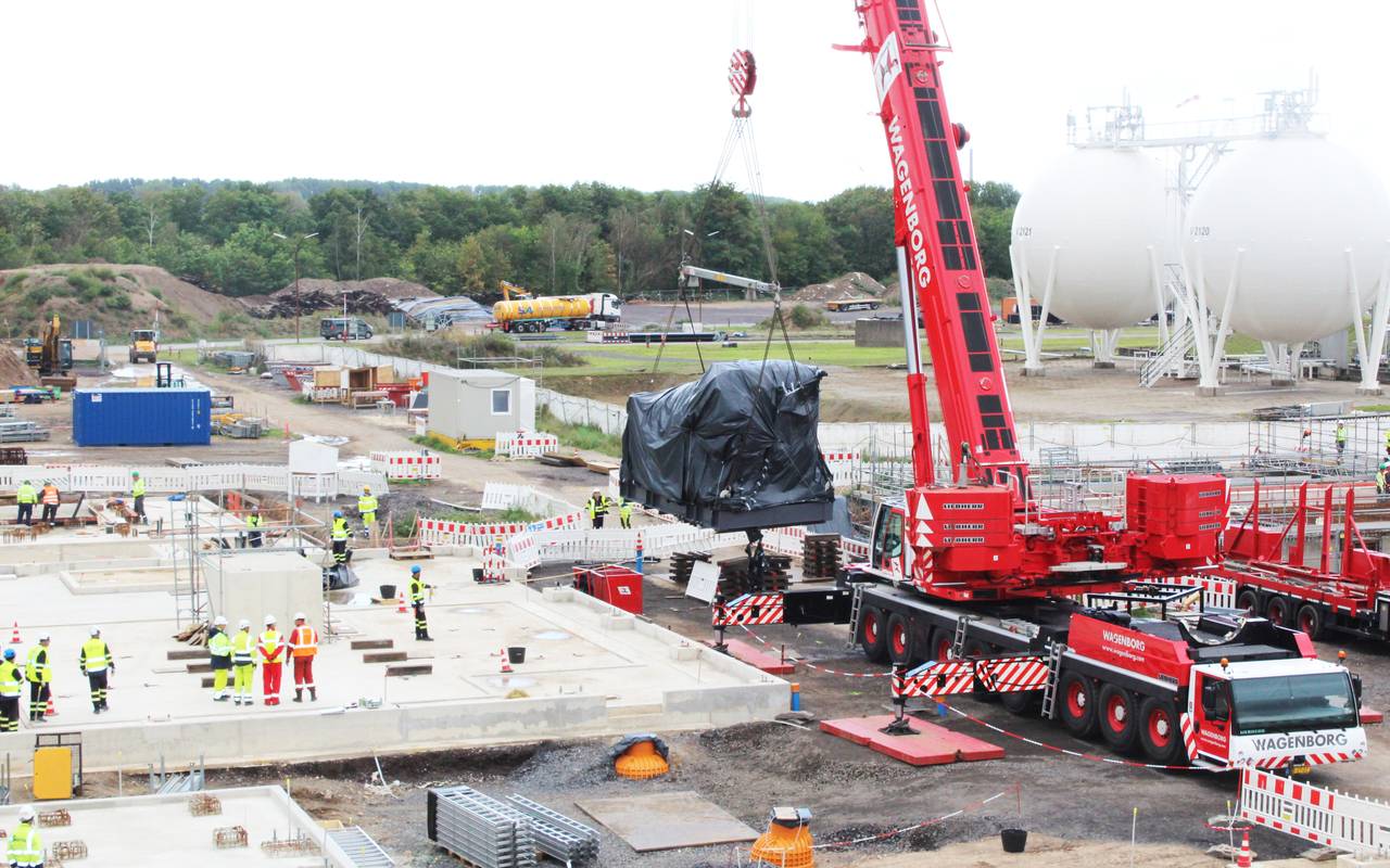 Am Shell-Werk in Köln-Godorf sind die Bauarbeiten zur Herstellung von umweltfreundlichen Lkw-Kraftstoff einen weiteren großen Schritt vorangekommen. Es wurde ein fast 40 Tonnen schwerer Kompressor in einer spektakulären Aktion auf das Gelände gehievt.