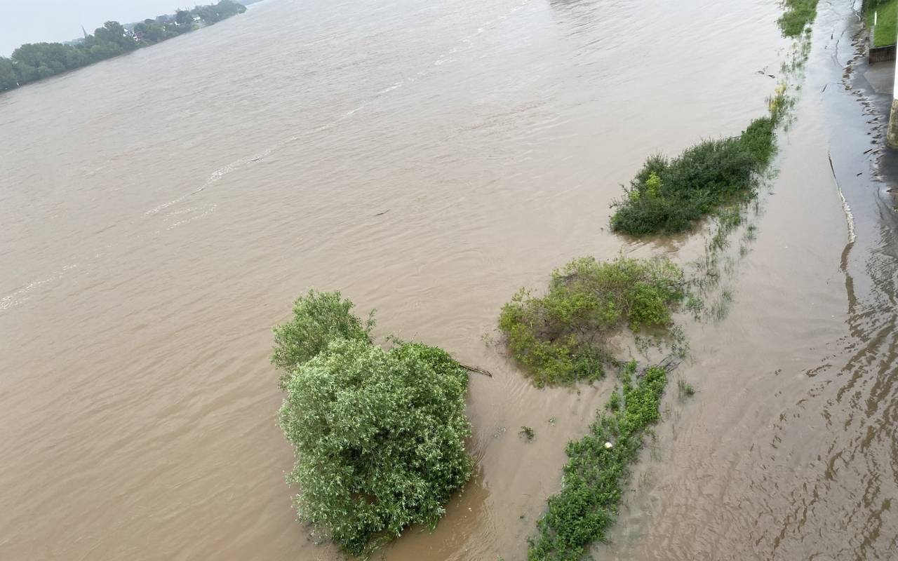 Der viele Regen lässt den Rhein auch in Köln und Wesseling steigen. Aktuell ist hier bereits der Weg unterhalb des Rheinforums überspült. Am Pfingstmontag hat der Rheinpegel in Köln den Wert von sieben Metern erreicht.