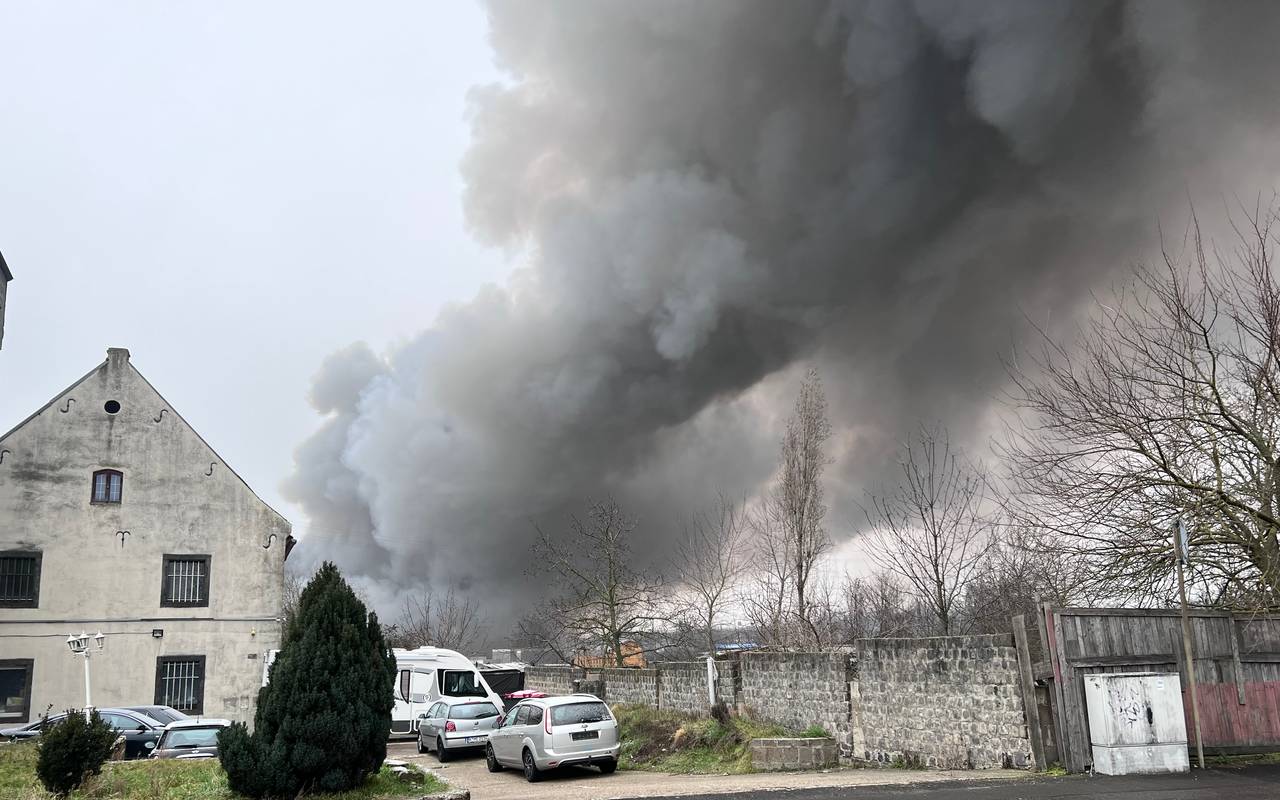 Riesige Rauchsäule über Hürth-Kalscheuren, da brennen seit dem Vormittag zwei Lagerhallen. Anwohner werden aufgefordert, wegen des Geruchs und Rauchniederschlag Fenster und Türen geschlossen zu halten. Klimaanlagen sollten ausgestellt werden.