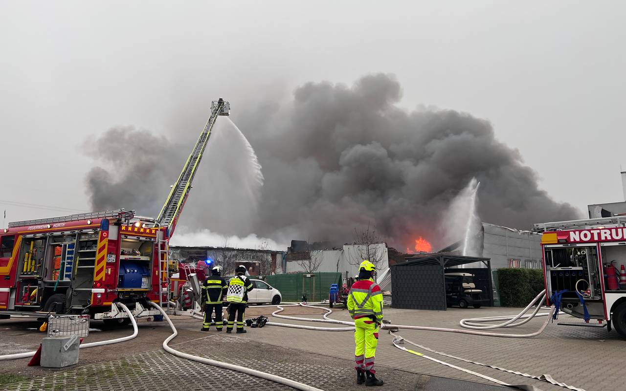 In Hürth-Kalscheuren sind am Montag (26. Januar) zwei große OmniDeal-Lagerhallen auf einem Gelände an der Straße "An der Hasenkaule" in Brand geraten. Die Feuerwehren aus Hürth und der Umgebung sind im Großeinsatz, um die Flammen zu bekämpfen. Mehrere Hallenteile sind bereits eingestürzt, was die Löscharbeiten zusätzlich erschwert. Laut einem Sprecher der Feuerwehr ist der Brand schwer unter Kontrolle zu bringen. Die Einsatzkräfte rechnen damit, dass die Löscharbeiten bis in den späten Abend andauern werden. In der Lagerhalle waren offenbar große Mengen Papier und Plastik gelagert, die das Feuer weiter anheizen.