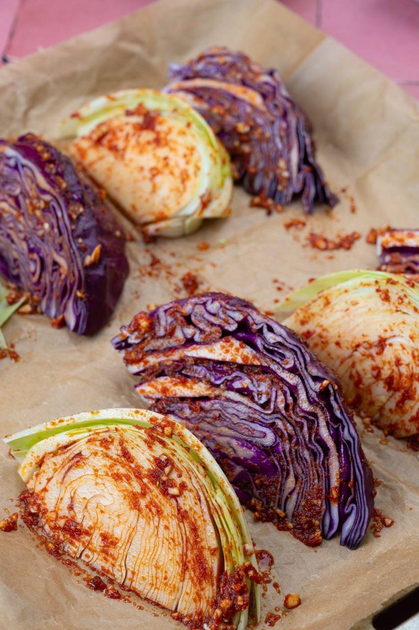 1. Zunächst den in Spalten geschnitten Rotkohl mit einer Paste aus 2 pressten Knoblauchzehen, 2 EL Tomatenmark, 8 EL Olivenöl, 2 TL Cumin, 1 TL Cayennepfeffer, 1 TL Meersalz bestreichen und 45 Minuten bei 190 Grad im Backofen rösten.