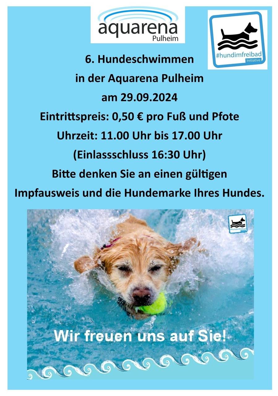 Noch einmal in diesem Jahr unter freiem Himmel schwimmen. Das geht am Sonntag, den 15. September noch bis 18 Uhr im Freibad der Aquarena in Pulheim. Danach geht das Freibad dann in die Winterpause. Aber noch nicht ganz. Denn in zwei Wochen dürfen noch mal alle Vierbeiner ins Wasser springen. Am 29. September steht wieder das große Hundeschwimmen an. Als Eintritt nimmt das Freibad 50 Cent pro Fuß und Pfote. Das 6. Hundeschwimmen in der Aquarena Pulheim geht von 11:00-17:00 Uhr.
