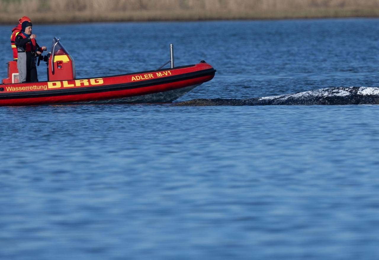 Nach drei Wochen an derselben Stelle war der Wal am Montagmorgen bei steigendem Wasserstand plötzlich losgeschwommen. Von Booten aus versuchten Helfer, ihn Richtung Ostsee zu treiben. Nach zwei Stunden stoppte das vermutlich erschöpfte Tier aber am Übergang der Bucht namens Kirchsee in die Wismarbucht, wo deutlich tieferes Fahrwasser Richtung Ostsee führt.