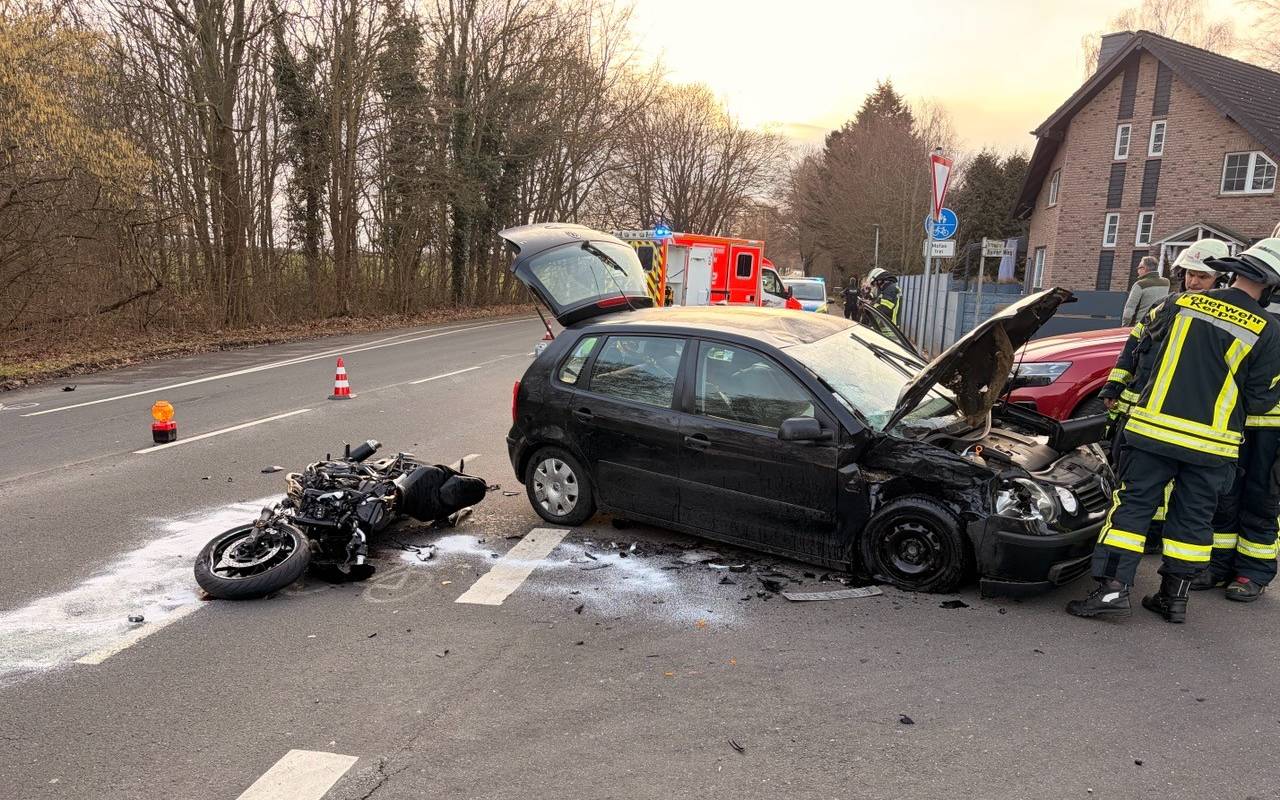 Am Mittwochnachmittag (18. Februar) kam es in Blatzheim an der Kreuzung Dürener Straße/Buirer Weg zu einem schweren Verkehrsunfall. Ein Kleinwagen und ein Motorrad stießen zusammen, wobei der 22-jährige Motorradfahrer durch die Wucht des Aufpralls zunächst auf die Windschutzscheibe des Polos und anschließend auf den Asphalt geschleudert wurde.