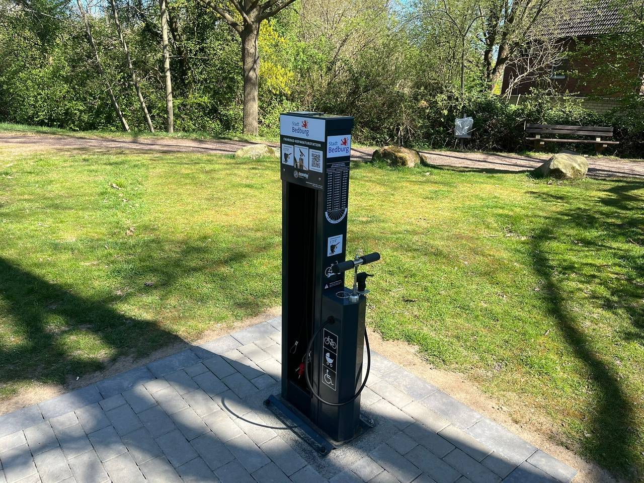 An der Station in Bedburg gibt es eine barrierefreie Picknickbank, eine Infotafel und eine Fahrrad-Servicestation zum Beispiel zum Aufpumpen der Reifen. Und auch wenn diese Stationen aktuell noch häufig geplündert werden – die Stadt Bedburg will sie immer wieder auffüllen.