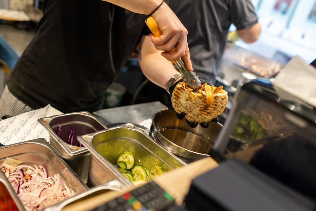 Wie ein herkömmlicher Döner wird sein Meerestier am Spieß mariniert und gebraten, schließlich vom Spieß geschnitten und auf einer Grillplatte gewürzt. Salat, Radieschen, Gurken und Aioli ins Fladenbrot – fertig und gar nicht so anders im Aussehen. Nur der Geschmack erinnert eher ans Mittelmeer als an den Bosporus.