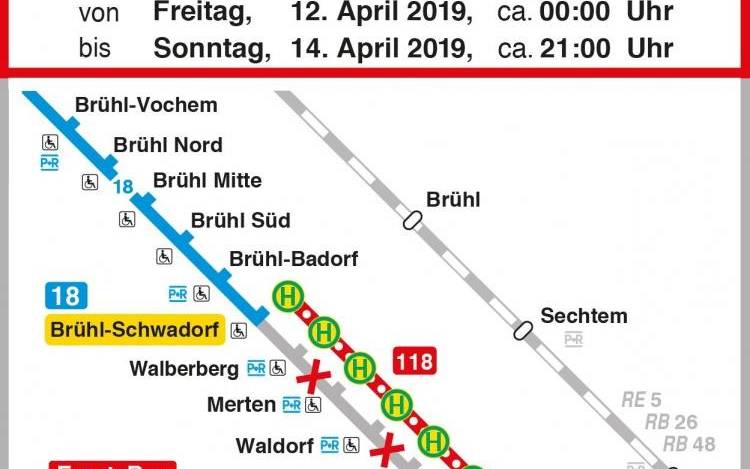 Heute Abend geht es los. Dann fährt keine Bahn zwischen Brühl-Schwadorf und Bornheim. Und zwar ab Freitag (12.04.19) ca. 00:00 Uhr bis Sonntag (14.04.19) ca. 21:00 Uhr.