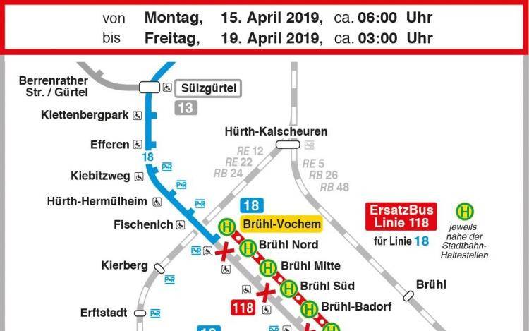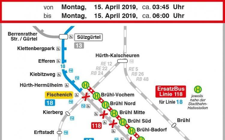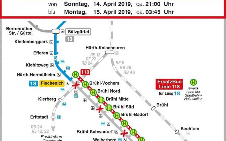 Von Sonntag (14.04.19) ca. 21:00 Uhr bis Montag (15.04.19) ca. 03:45 Uhr verkehrt die Linie 18 nur zwischen Thielenbruch und Fischenich bzw. zwischen Bornheim und Bonn Hbf.