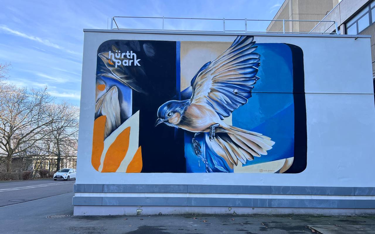 Am Hürth Park ist ein neues, großflächiges Graffiti entstanden. Das Kunstwerk wurde auf den Kubus an der Rückseite des Einkaufszentrums gesprayt und zeigt auf drei großen Flächen einen Vogel, Blumen, einen Schmetterling sowie die Kölner Skyline.