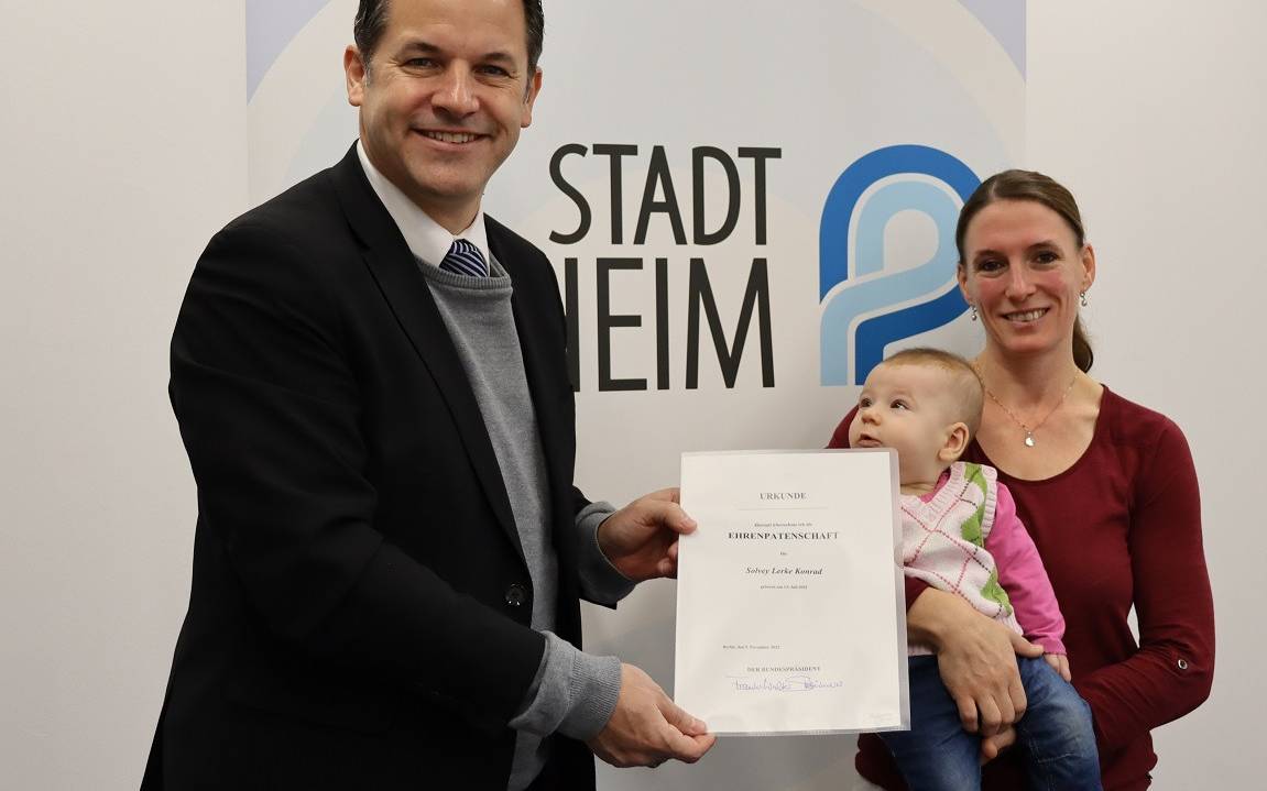 Damit betone man die besondere Verpflichtung des Staates für kinderreiche Familien, heißt es von der Stadt. Vor diesem Hintergrund wies Bürgermeister Keppeler auch auf die verschiedenen Unterstützungsangebote für Familien in Pulheim hin. Keppeler überreichte der Mutter Rebecca Konrad auch die Paten-Urkunde für das Mädchen.