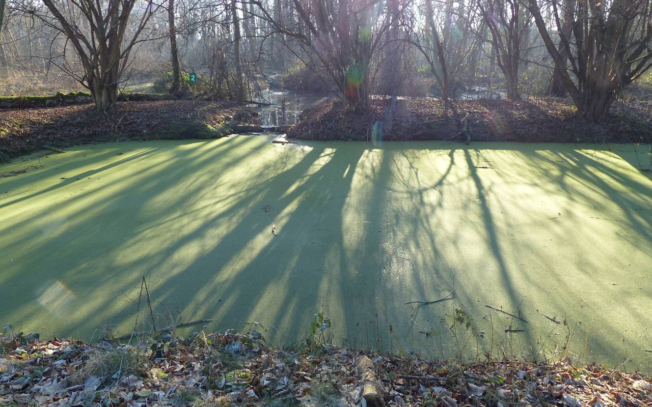 Ein seltenes Schauspiel gibt es gerade an der Großen Laache in Pulheim zu sehen. Die Teichlandschaft dort ist zugefroren und das Eis schimmert grün.