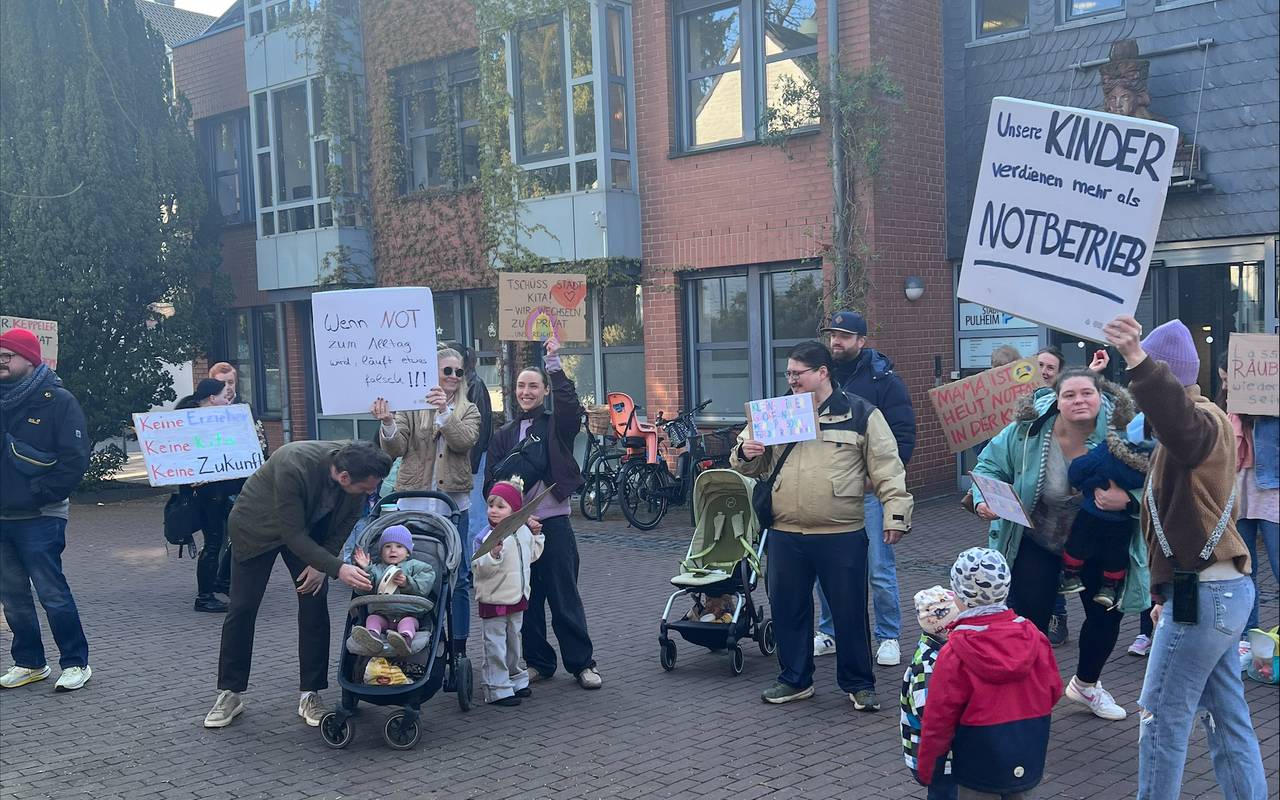 In Pulheim haben Eltern von Kita-Kindern gegen die personelle Lage an der Kita Räuberhöhle in Stommeln protestiert. Dazu haben sie am Dienstagmorgen vor dem Rathaus mit Schildern, Trillerpfeifen und Rasseln demonstriert.