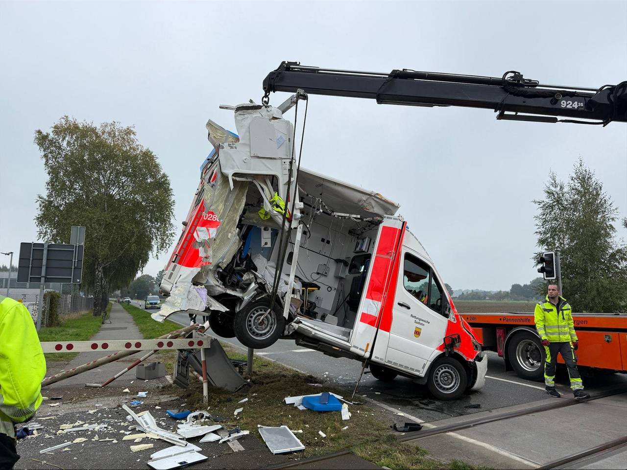 Der zerstörte Krankenwagen wurde am Vormittag geborgen. Die rund 100 Fahrgäste wurden mit Bussen zur nächsten Haltestelle gebracht, wie ein Sprecher der Deutschen Bahn sagte. Zwischenzeitlich wurde ein Schienenersatzverkehr eingerichtet. Inzwischen ist die Bahnstrecke wieder frei.