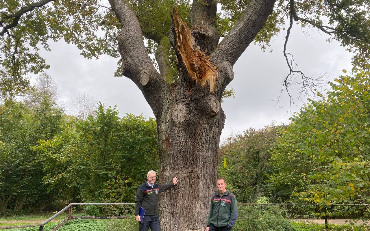 Im Sommer sind durch mehrere Gewitter zwei starke Äste abgebrochen. Zudem leidet der Baum unter einem Pilzbefall, der zu Fäulnis führt. Ein Fachgutachten empfiehlt daher, die Krone des Baums stark zu kürzen, um die Eiche zu entlasten.