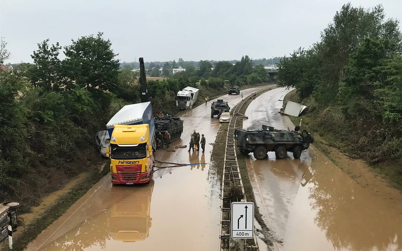 Der weiter sinkende Pegel der Erft sorgt jetzt dafür, dass die Retter zu den Autos auf den Straßen vordringen können, die von den Fluten überschwemmt worden waren. Nach Angaben der Stadt Erftstadt sind Radpanzer der Bundeswehr gerade dabei, Fahrzeuge auf der B265 zu bergen. Demnach wurden bisher keine Personen in den Fahrzeugen gefunden. Es wird geplant die B265 heute zu entwässern. Die K44 ist wieder frei, sodass das Stadtteile Liblar und Lechenich wieder direkt verbunden sind.