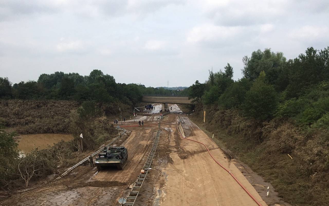 Soldaten vom Fliegerhorst Nörvenich werden heute wieder mit Tornados die Erft überfliegen und die Lage von der Luft aus prüfen. So sollen mögliche Hochwasser-Problemstellen entlang des Flusses analysiert werden. In Erftstadt-Blessem ist die Situation an der Abbruchkante laut dem Krisenstab des Rhein-Erft-Kreises weiter stabil. Man könne die Häuser vermutlich dauerhaft sichern, heißt es. Die Auswertungen der Geologen laufen aber noch.