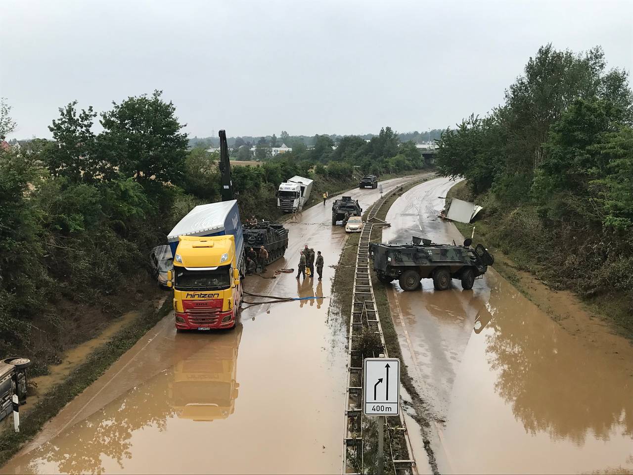 Der weiter sinkende Pegel der Erft sorgt jetzt dafür, dass die Retter zu den Autos auf den Straßen vordringen können, die von den Fluten überschwemmt worden waren. Nach Angaben der Stadt Erftstadt sind Radpanzer der Bundeswehr gerade dabei, Fahrzeuge auf der B265 zu bergen. Demnach wurden bisher keine Personen in den Fahrzeugen gefunden. Es wird geplant die B265 heute zu entwässern. Die K44 ist wieder frei, sodass das Stadtteile Liblar und Lechenich wieder direkt verbunden sind.