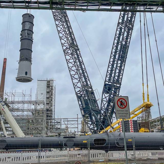 In den letzten Tagen sind bei Shell in Wesseling zwei beeindruckende Bauteile eingetroffen. Diese über 50 und über 30 Meter hohen Kolonnen sind wesentliche Bestandteile der neuen Grundöl-Anlage.