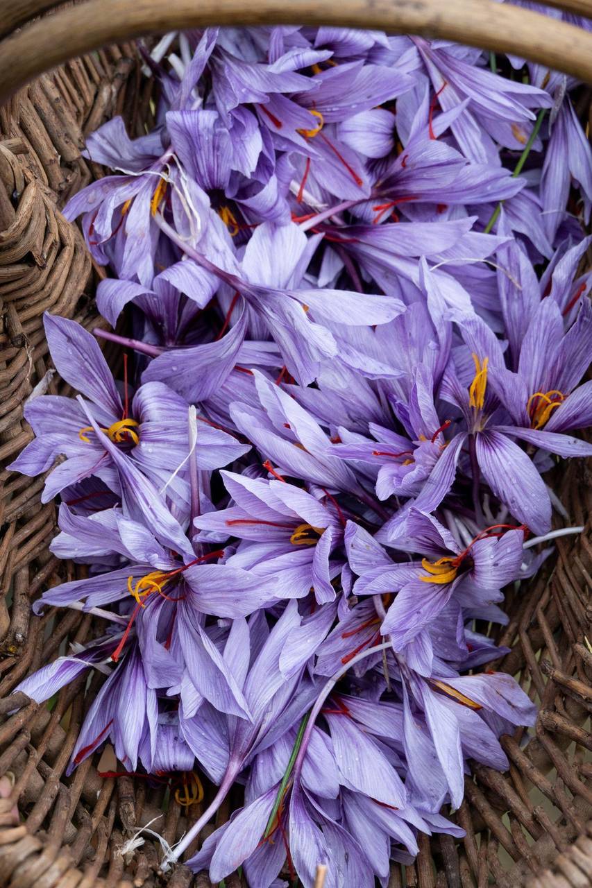 Safranblüten liegen in einem Körbchen. Jede hat lange rote Fäden. Für einen Tee etwa braucht es 3 Fäden, für eine Suppe etwa 10 bis 15.