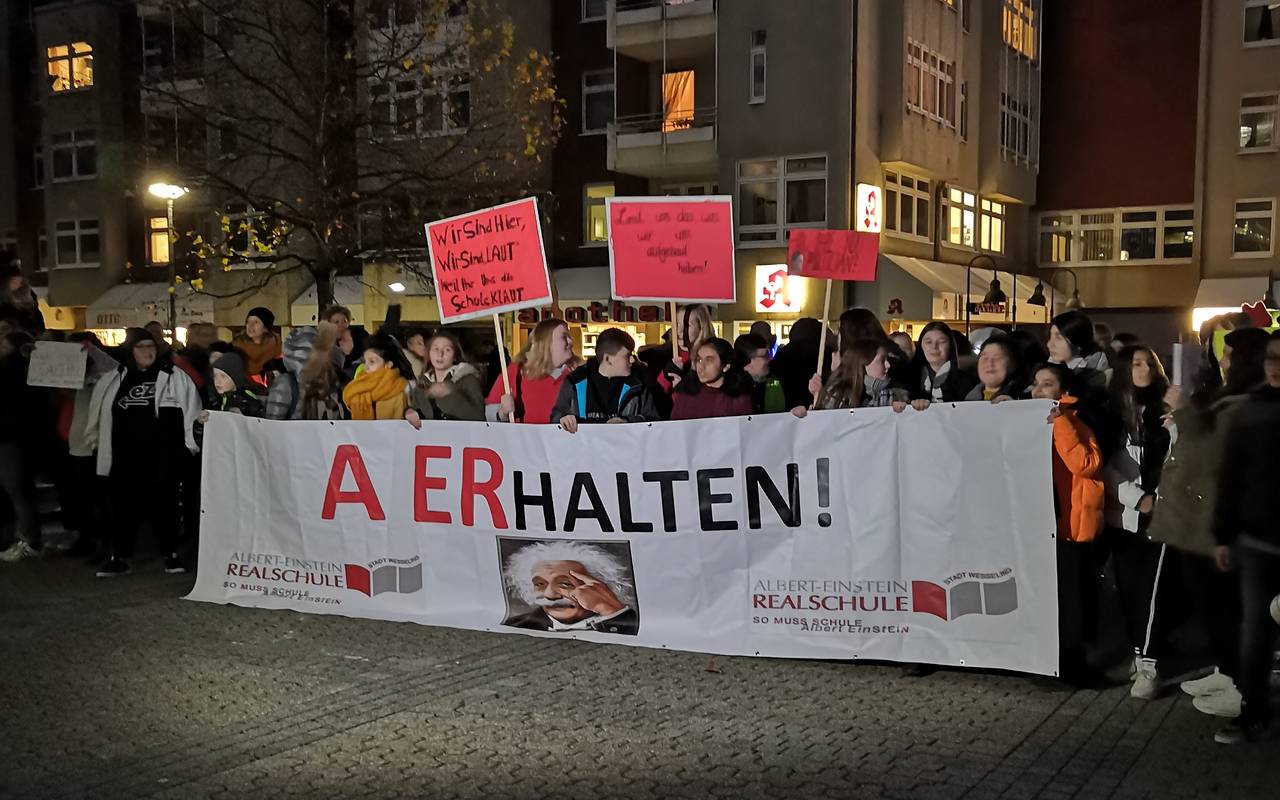 Ich möchte meinen Kindern nicht erzählen, wie schön die Albert-Einstein-Realschule war – sie sollen es selbst erleben können. So ein Schüler bei der Demo vor dem Wesselinger Rathaus am Mittwochabend.