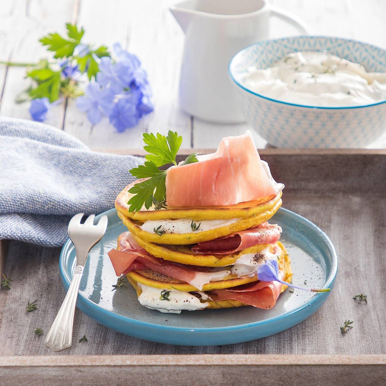 Parmaschinken lässt sich gut mit Pfannkuchen und einem Joghurt-Topping servieren.