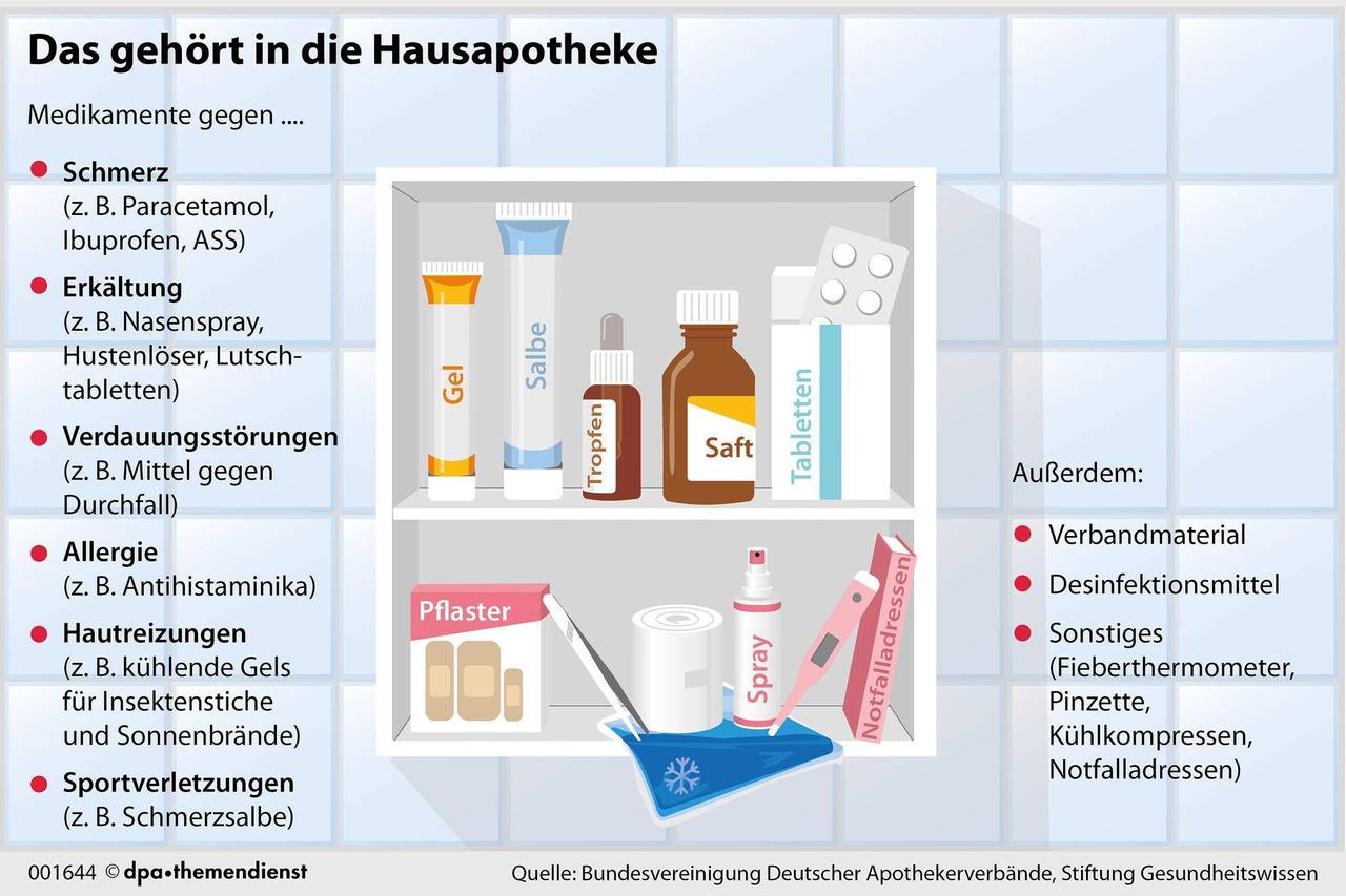 Am Ende ist so eine Hausapotheke aber eine sehr individuelle Angelegenheit. Armin Hoffmann nennt ein Beispiel: Leben Kinder im Haushalt, sieht sie anders aus, als wenn sie nur für Erwachsene gedacht ist. Und wenn man direkt um die Ecke eine Apotheke hat, fällt sie womöglich etwas schmaler aus, als wenn die nächste 20 Minuten Autofahrt entfernt ist. Ein Überblick: