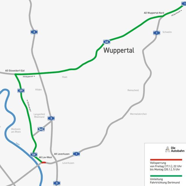 Autofahrer müssen das ganzen kommende 2. Adventswochenende über mit vielen Behinderungen rund um das Leverkusener Kreuz rechnen. Die A1 ist zwischen dem Kreuz Leverkusen-West und Leverkusen in beide Richtung wegen Arbeiten an der Rheinbrücke gesperrt. Zahlreiche Umleitungen sind über die A59 eingerichtet, heißt es von der Autobahn GmbH.