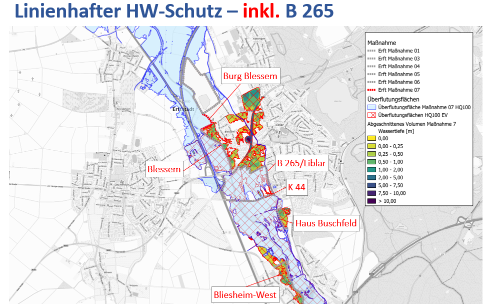 Das Ergebnis: Südlich der K44 zwischen Liblar und Bliesheim könnte ein sogenannter Retentionsraum entstehen – also eine Fläche, auf die Hochwasser gezielt abgeleitet wird, um Wohngebiete wie Bliesheim, Blessem, Frauenthal, Liblar und den Bereich um Haus Buschfeld besser zu schützen. Bis zu eine Million Kubikmeter Wasser könnten dort im Ernstfall zurückgehalten werden. Ein weiterer Vorteil: Die Maßnahme ließe sich mit einer geplanten Renaturierung der Erft kombinieren.