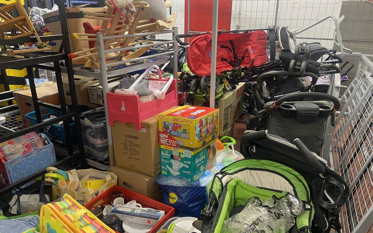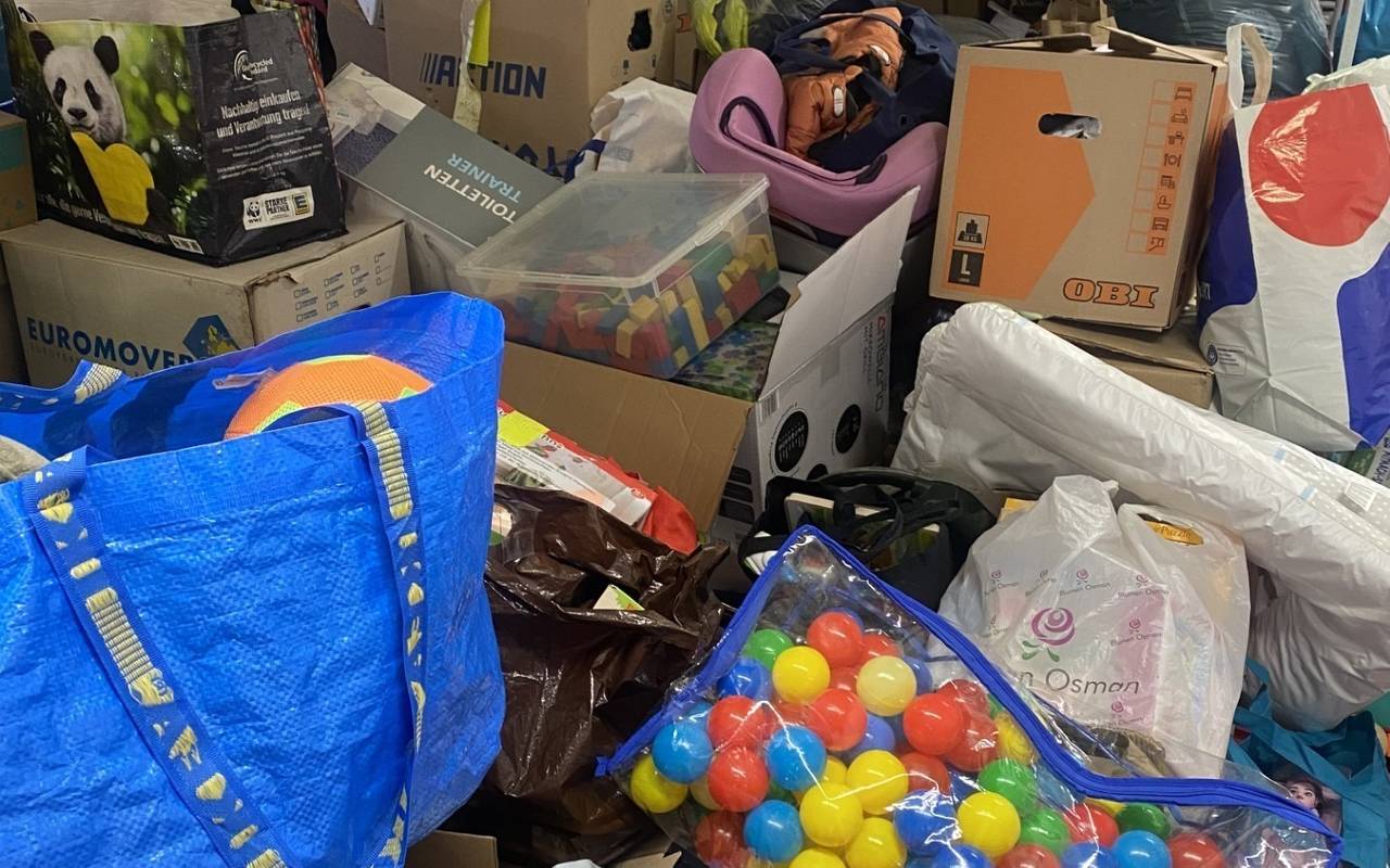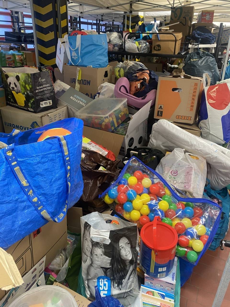 Die Halle in der Schützenstraße ist jetzt bis oben hin voll. Jetzt werden die gespendeten Sachen sortiert und dann an die Familien gegeben. Was übrig bleibt, geht unter anderem ins Sozialwarenhaus in Frechen.