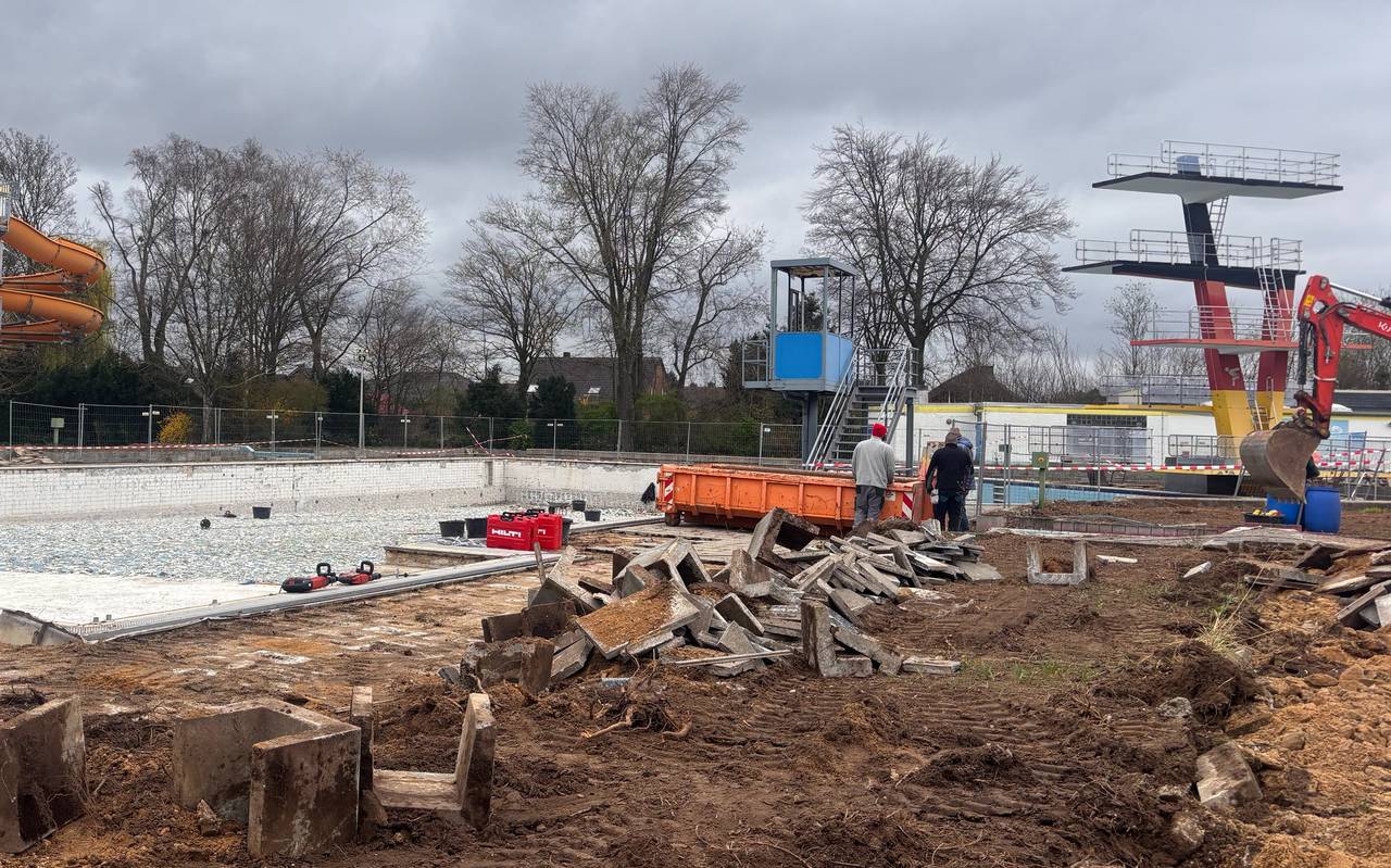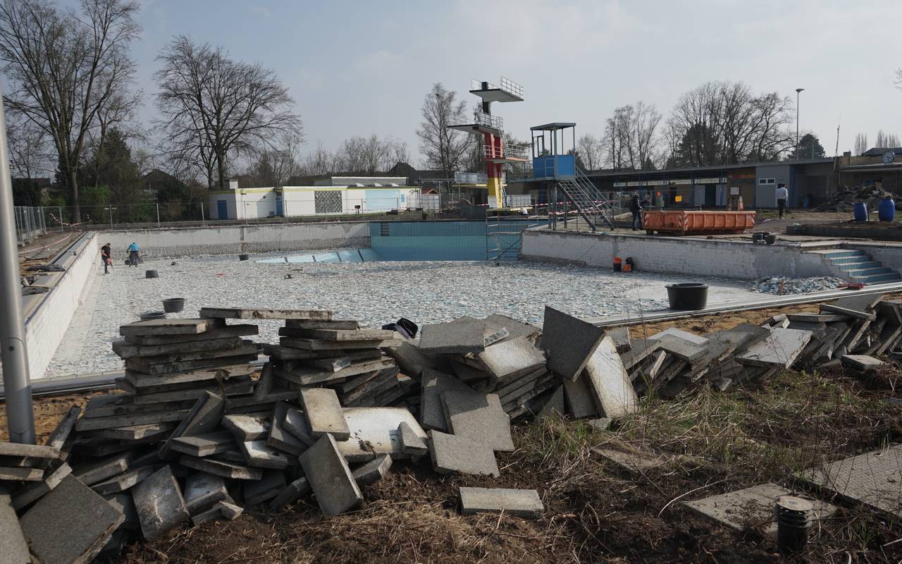 Das Freibad in Elsdorf wird umfassend modernisiert und attraktiver gestaltet. Seit rund einer Woche sind die Bauarbeiten in vollem Gange: Presslufthämmer rattern und Bagger fahren über das Gelände. Im ersten Schritt konzentrieren sich die Bauarbeiter auf den Rückbau. Dabei werden Gehwegplatten entfernt, das 50-Meter-Becken entkernt und der Beckenrand abgeschnitten.