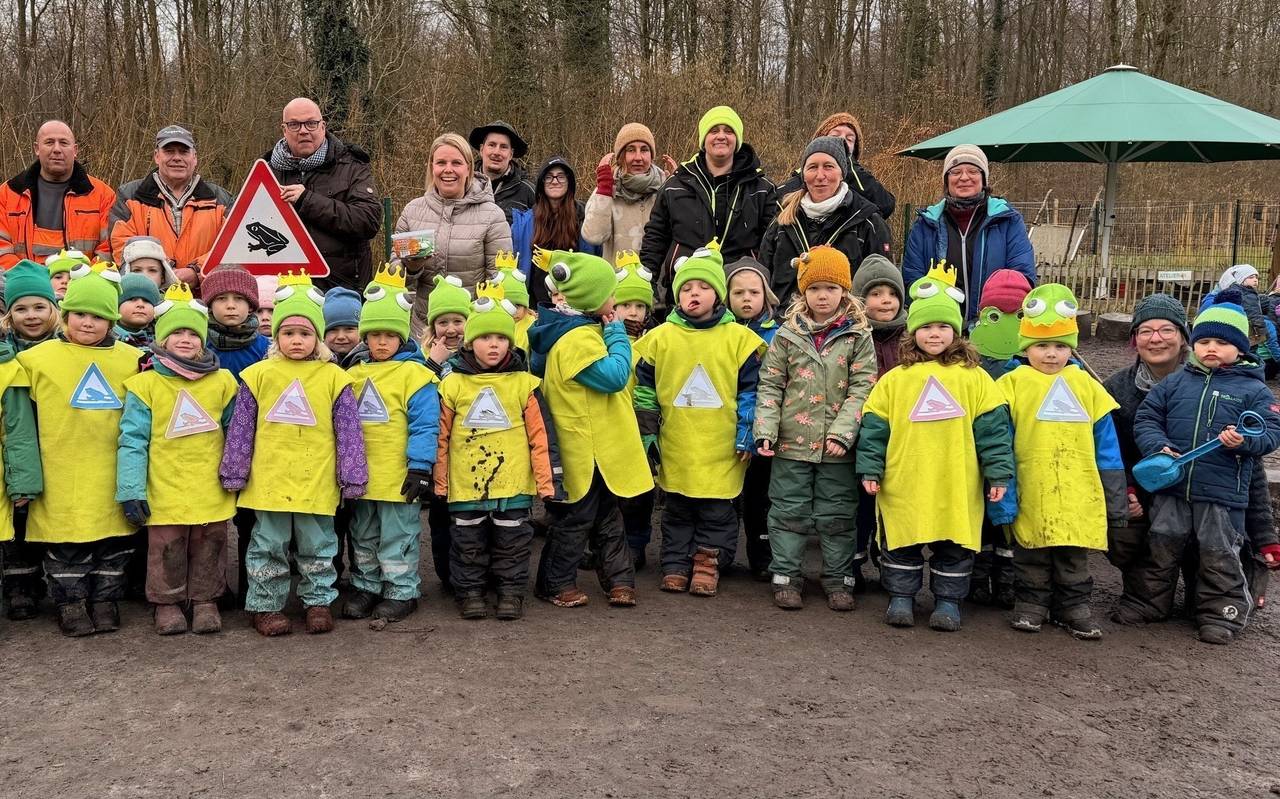 Seit vielen Jahren engagiert sich der Königsdorfer Kindergarten in Frechen für den Amphibienschutz. Jetzt wurde der Einsatz belohnt: Mit offiziellen Straßenschildern für den Krötenschutz.