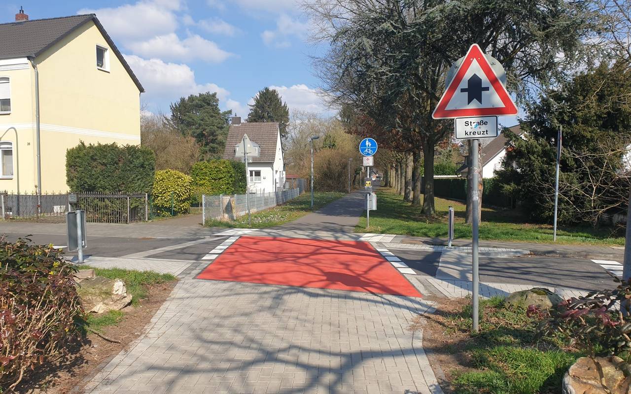 Radfahrer auf dem Villebahnradweg in Brühl kommen jetzt sicherer über die Straßen. Die Stadt hat am Mühlenbach und am Daberger Weg Querungsstellen eingerichtet, die auf der Fahrbahn rot markiert sind. An diesen Stellen haben Radfahrer Vorfahrt, und Autos müssen anhalten, um sie passieren zu lassen.