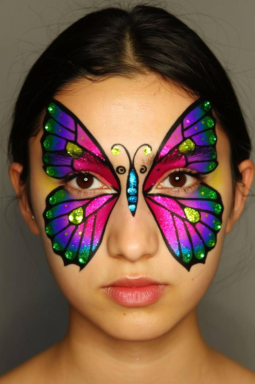 Zunächst das Gesicht grundieren. Danach wird die Form der Schmetterlingsflügel angelegt: Dafür mit schwarzem Eyeliner geschwungene Linien über Augen und Wangen ziehen. Anschließend die Flächen mit buntem Lidschatten ausmalen und die Farben weich ineinander verblenden. Feine Punkte oder Linien sorgen für zusätzliche Details, Highlights lassen sich mit Glitzer setzen.