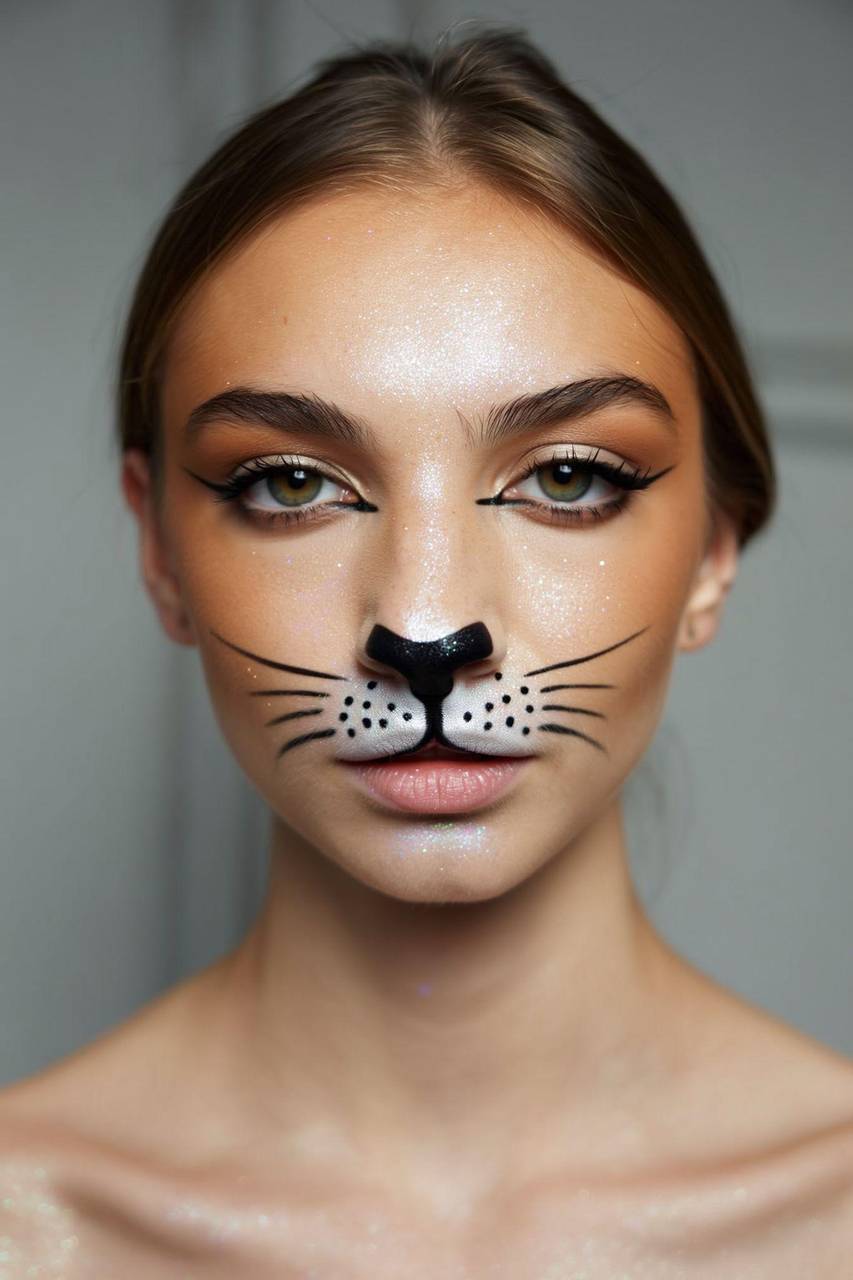 Danach wird die Nasenspitze schwarz ausgemalt - und von dort aus feine Linien auf die Wangen gezogen. Sie sollen die Schnurrhaare andeuten. Anschließend Lidschatten auftragen und sanft verblenden. Die Lippen können - je nach gewünschtem Stil - natürlich bleiben oder mit rotem Lippenstift farblich stärker betont werden. Wer mag, setzt zum Schluss dezente Glitzerakzente auf Stirn oder Augenpartie.