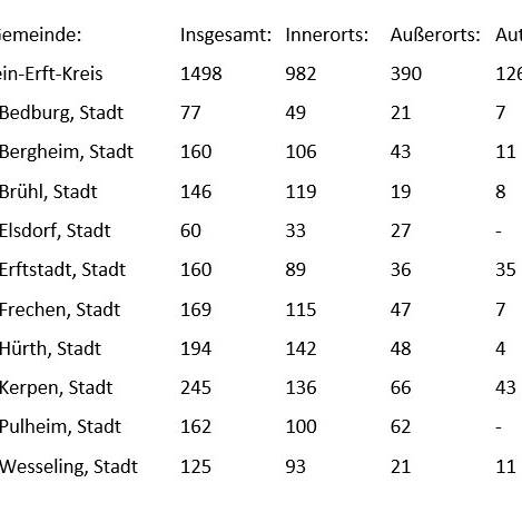 Spitzenreiter in der aktuellen Statistik ist Kerpen mit 245 Unfällen mit Verletzten, gefolgt von Hürth mit 194. Bergheim (160), Erftstadt (160), Pulheim (162), und Frechen (169) liegen alle bei ungefähr 160 bis 170 Unfällen. Am geringsten ist die Zahl in Elsdorf. Hier gab es im letzten Jahr 60 Unfälle mit Verletzten, zwei weniger als im Jahr davor.