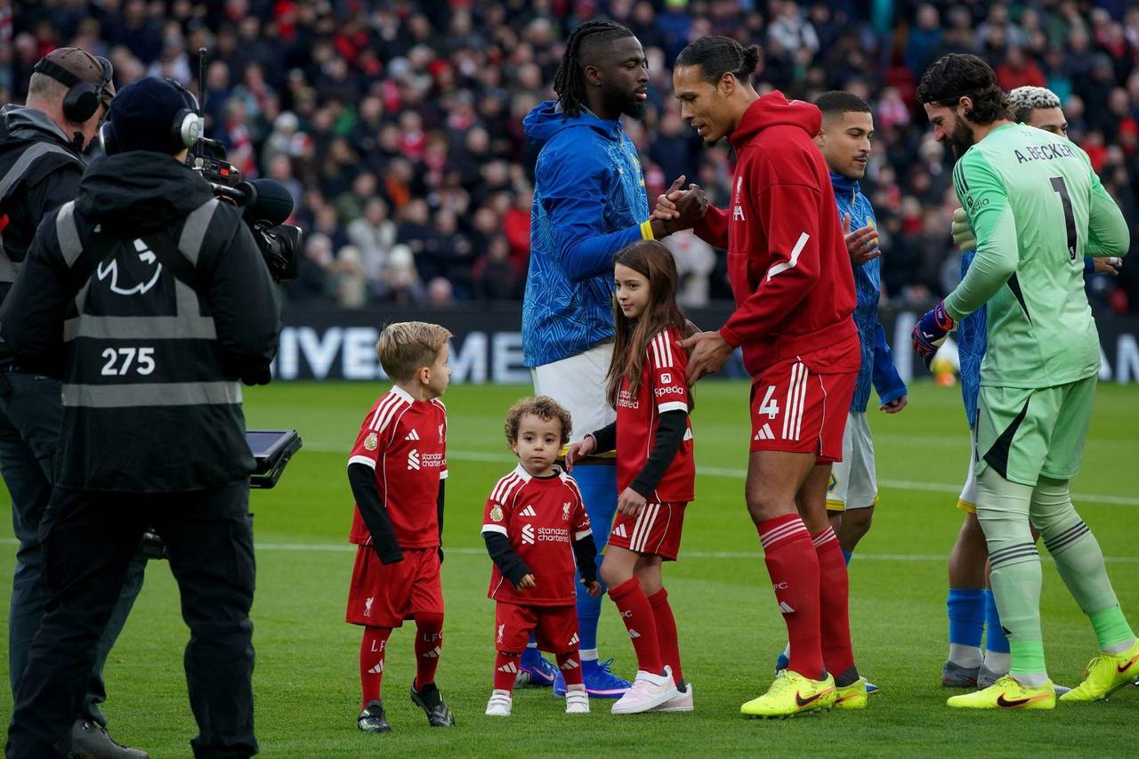 Bewegende Momente vor dem Anpfiff: Diogo Jotas Kinder, Dinis und Duarte, begleiten die Liverpool-Profis aufs Spielfeld.© Ian Hodgson/AP/dpa