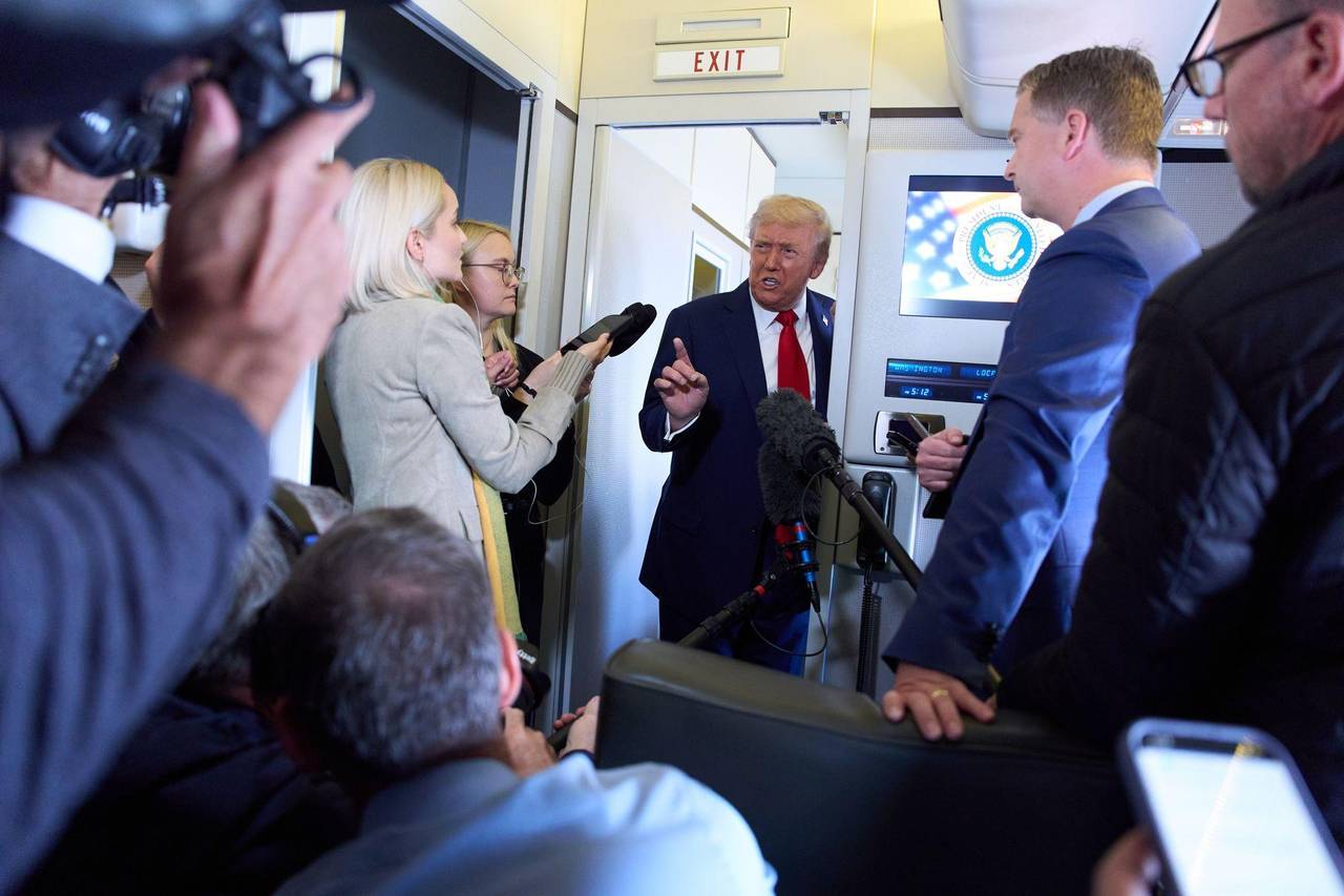 US-Präsident Donald Trump (M) erklärt an Bord der Air Force One den Gaza-Krieg für beendet. (Archivbild)© Evan Vucci/AP/dpa