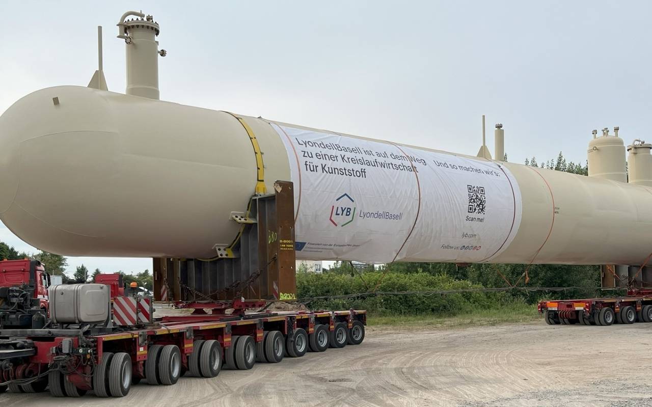 Bei LyondellBasell in Wesseling sind in der Nacht zu Mittwoch (21. Mai) zwei Großtanks angeliefert worden. Viele Straßen im Bereich Godorf waren dafür gesperrt. Die Tanks gehören zum Bau der großtechnischen chemischen Recyclinganlage. Jeder ist neuen Meter hoch und über fünf Meter breit und fasst 260.000 Liter. Inklusive Anhänger war der Transporter beeindruckende 63 Meter lang. In den Tanks wird künftig Pyrolyseöl gelagert – ein Rohstoff, der aus schwer recycelbaren Kunststoffabfällen gewonnen wird.