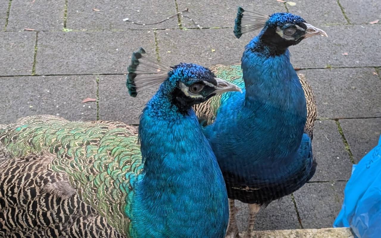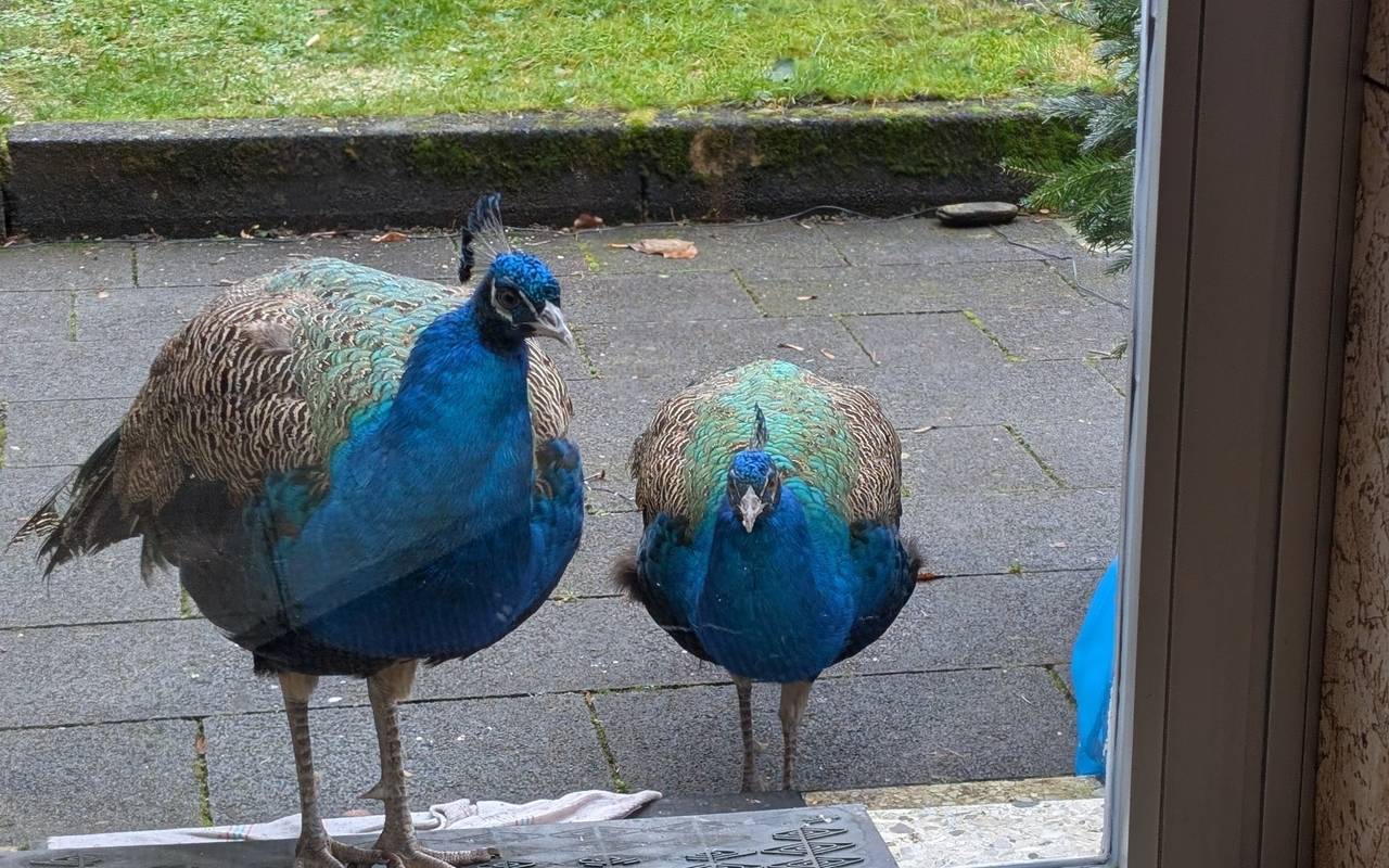 In einem Garten in Kerpen-Türnich sind seit ein paar Tagen immer wieder zwei Pfauen zu Besuch. Unklar ist allerdings, wem die Tiere gehören und wo sie ausgebüxt sind.